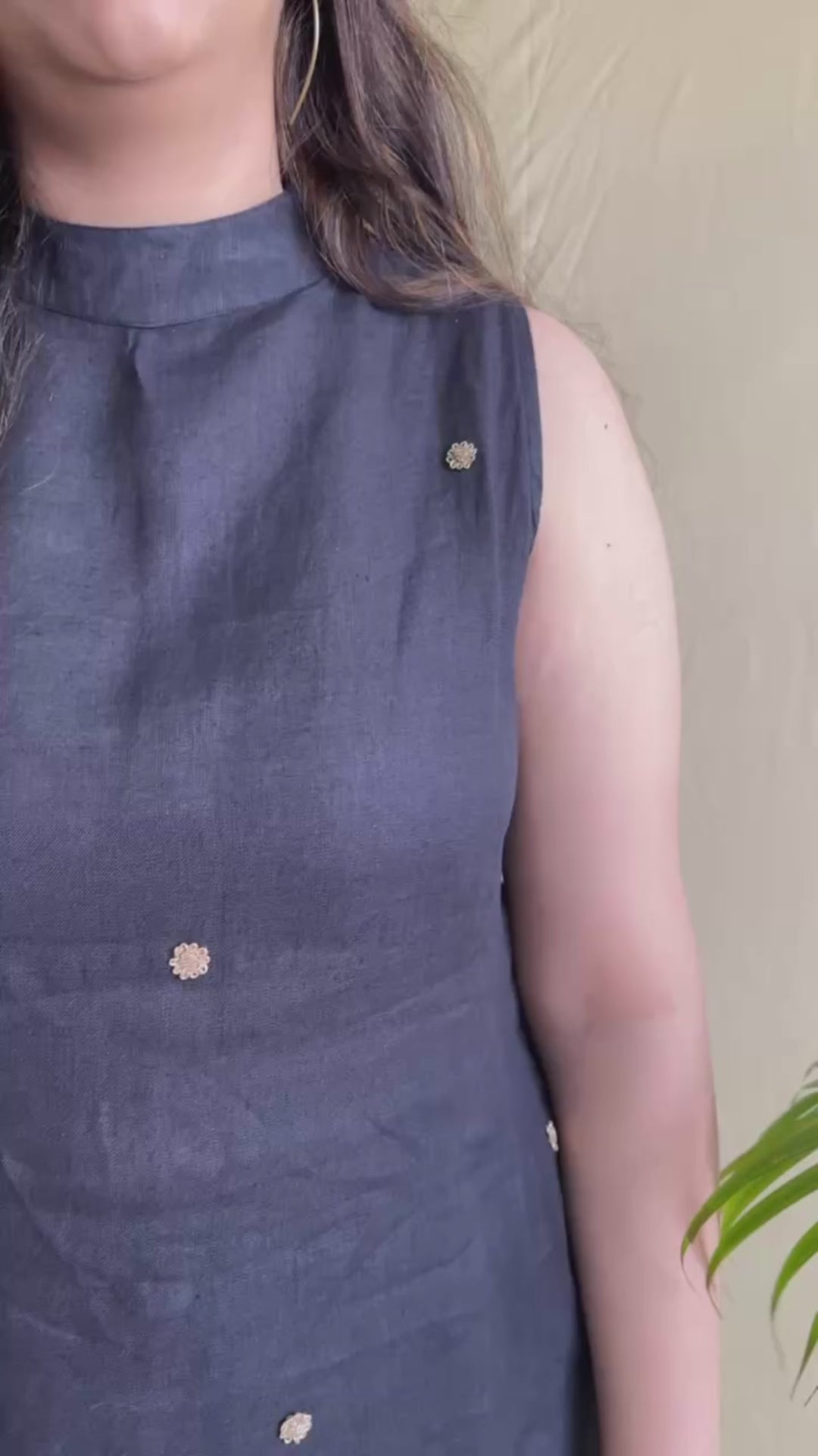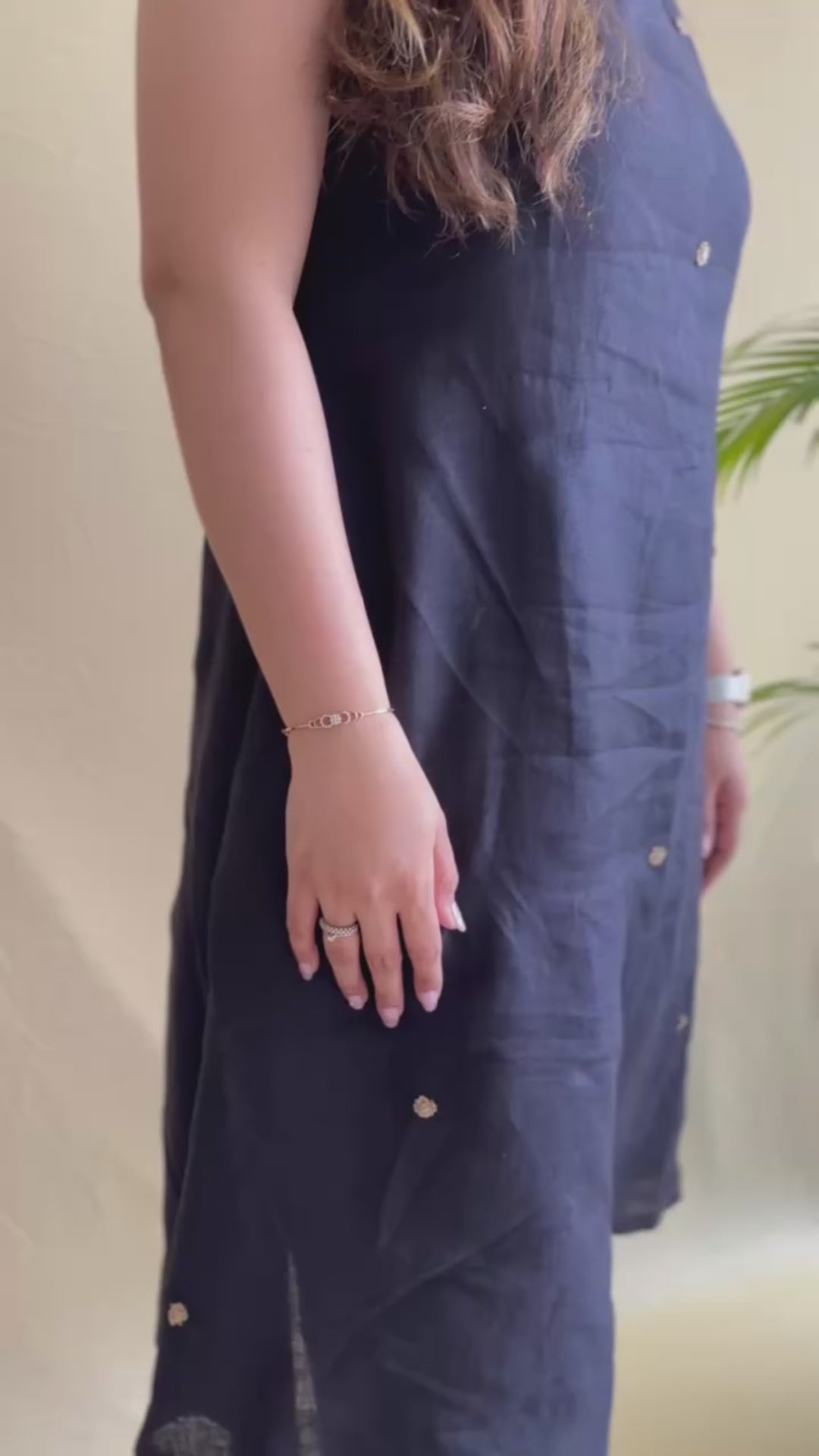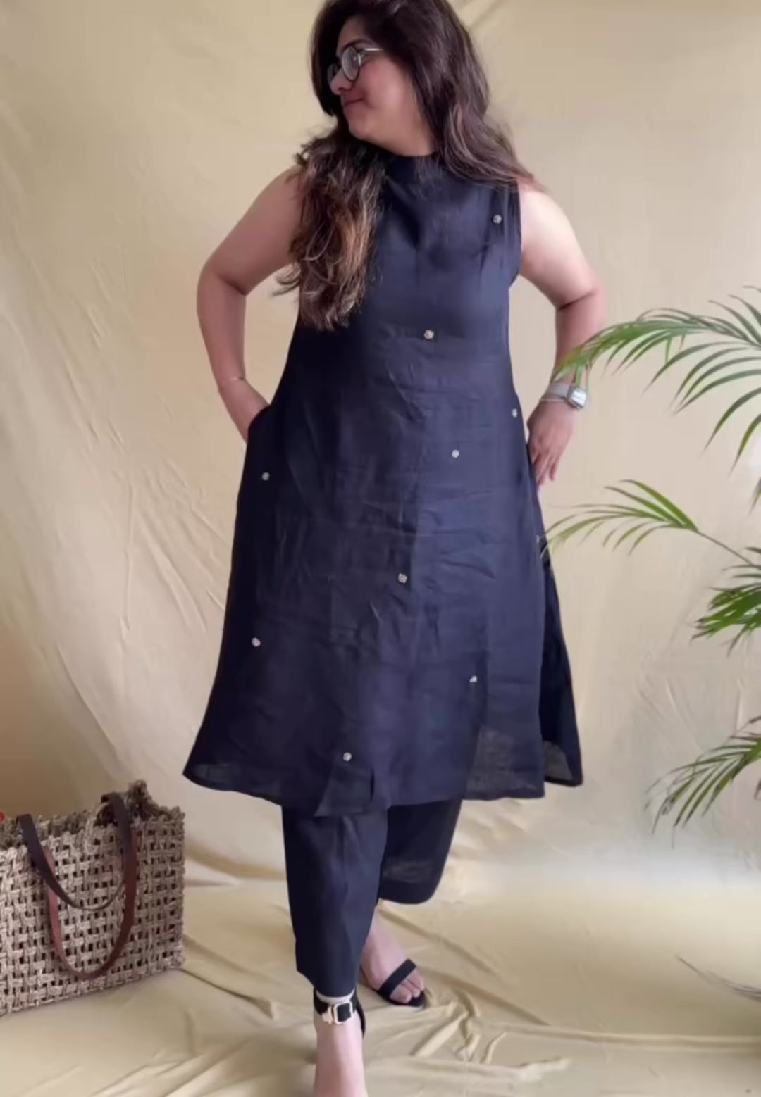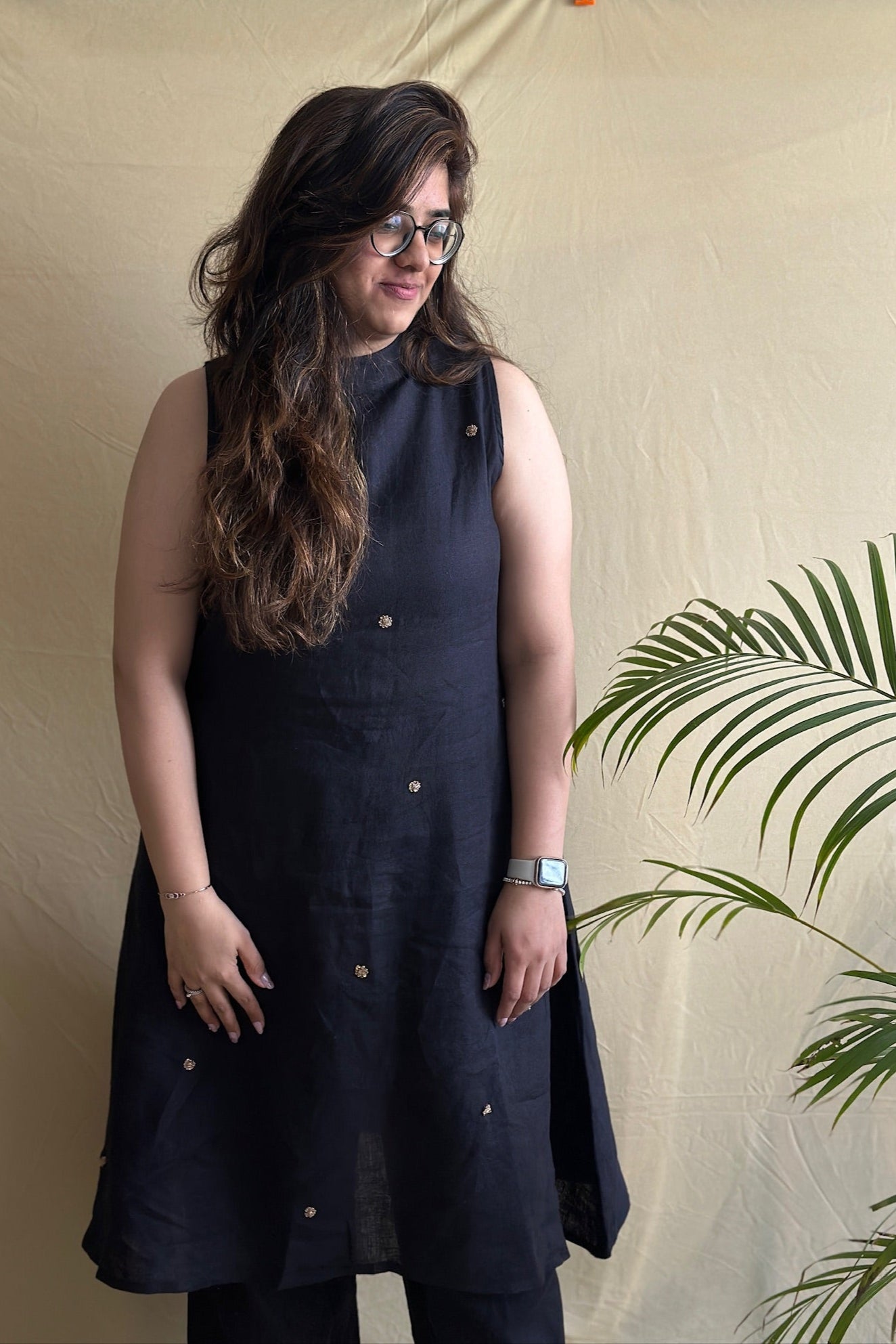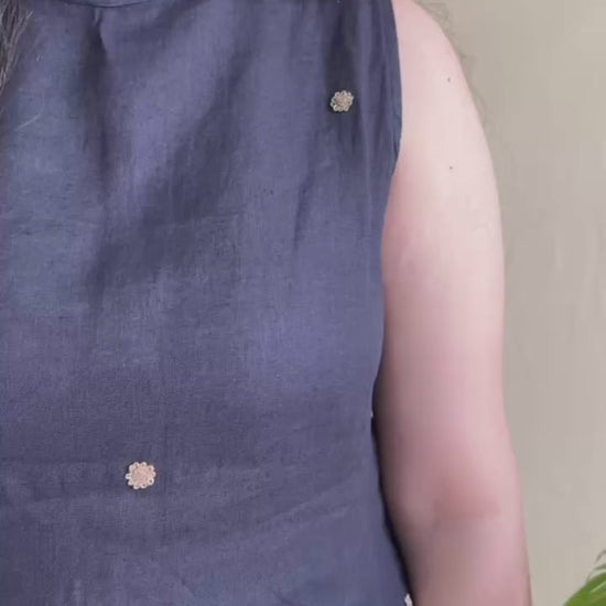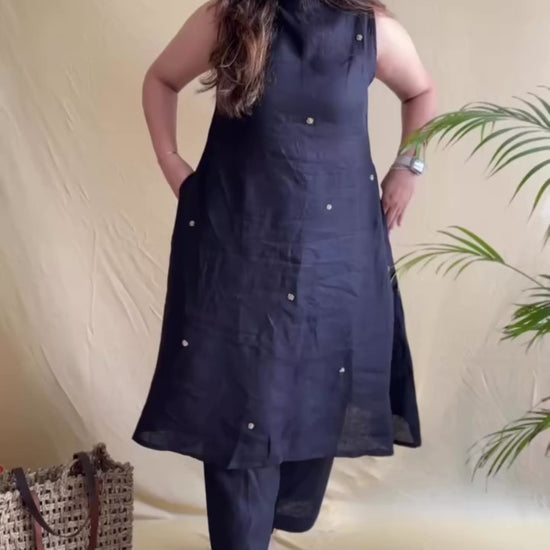 This pure linen black kurti set is designed with intricate zardosi booties, adding detail to a timeless silhouette. The A-line design gives a comfortable summer fit, making it suitable for both work and casual wear.