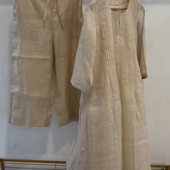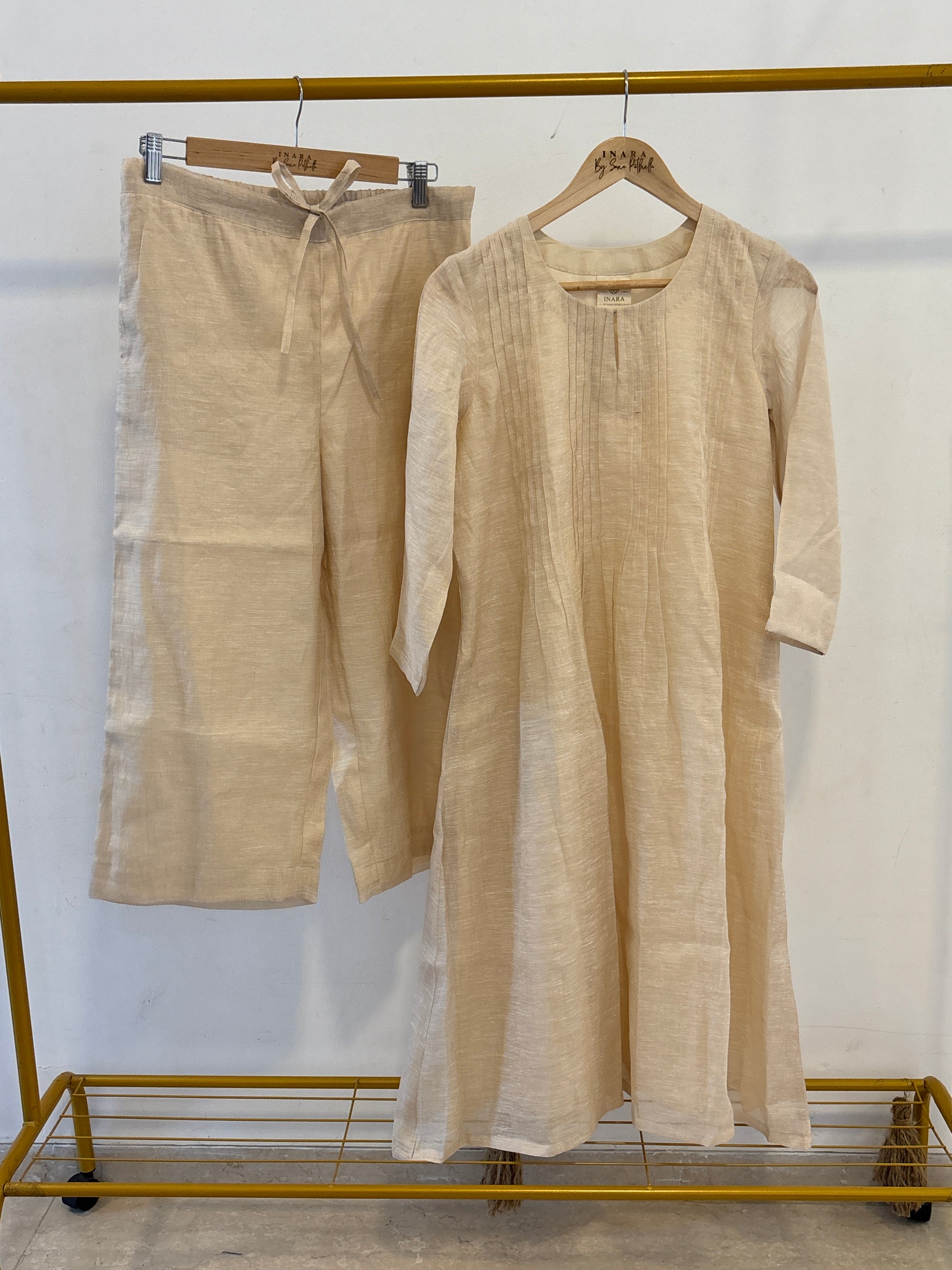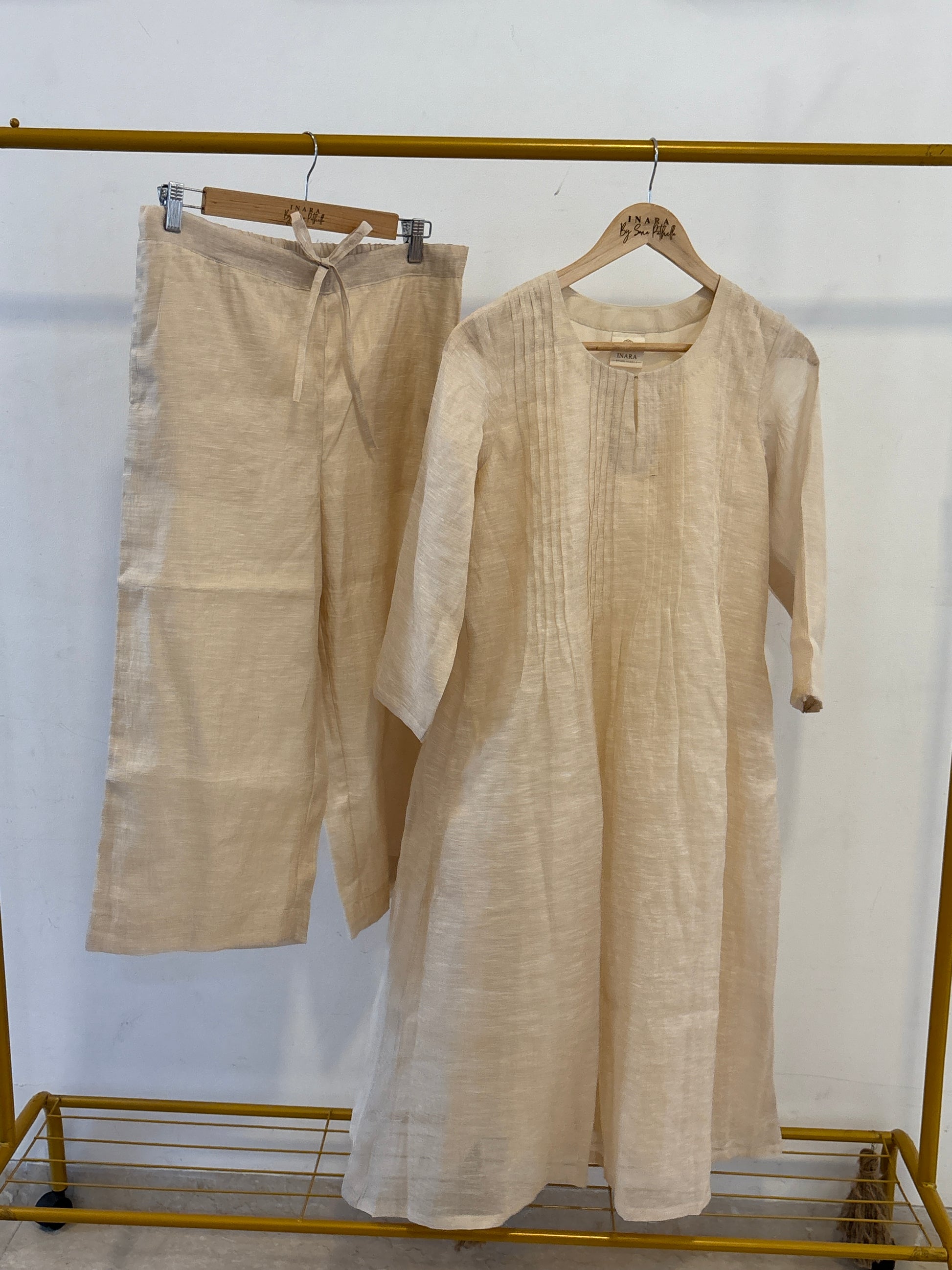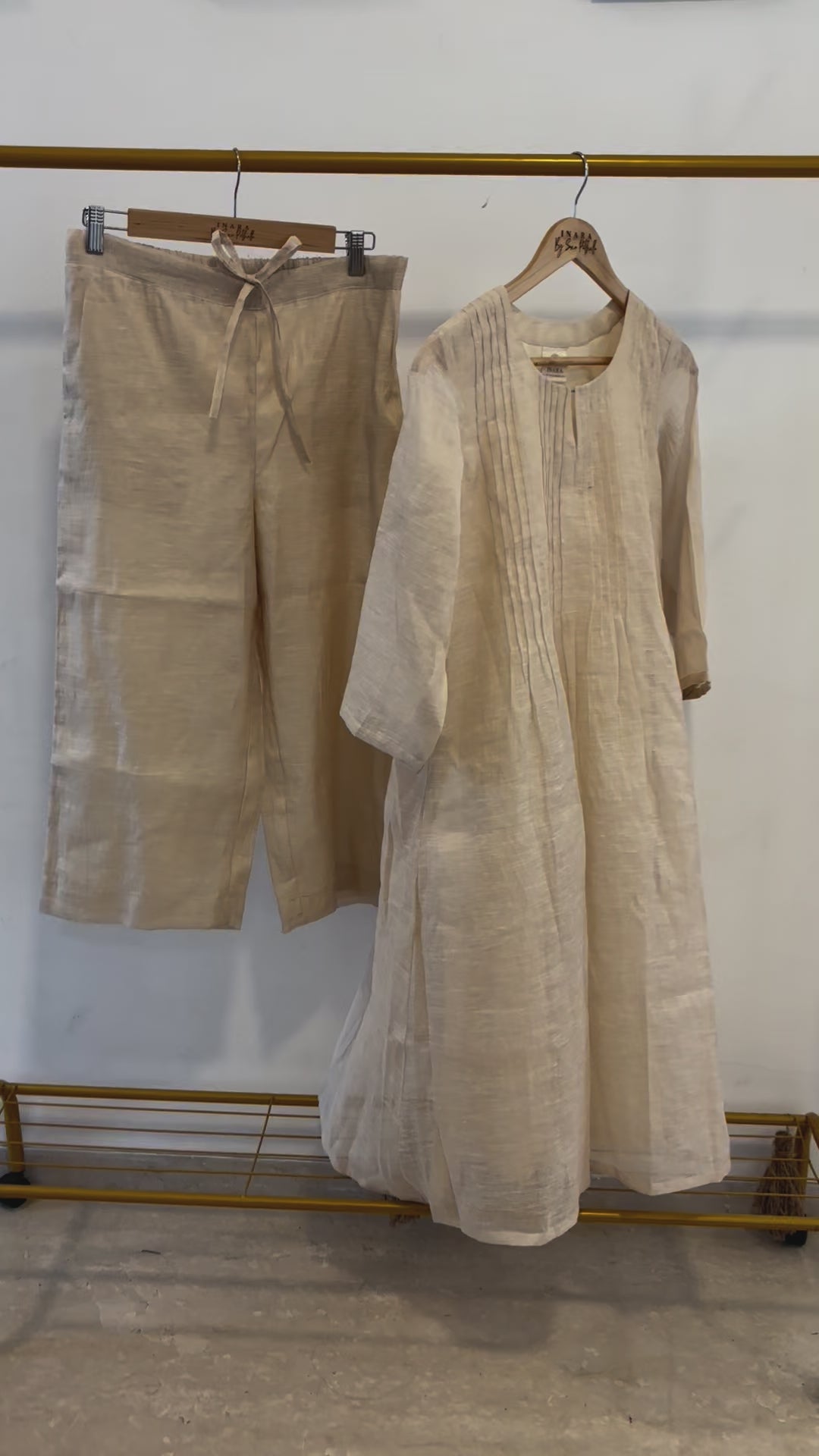 The pintucks pleats, pattern and dori tie with tassels add a playful yet refined touch, perfect for festival wear or casual outings. Available in customizable shades like pink, purple, off-white, and brown, this organic linen kurti set is designed for comfort and style.