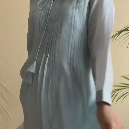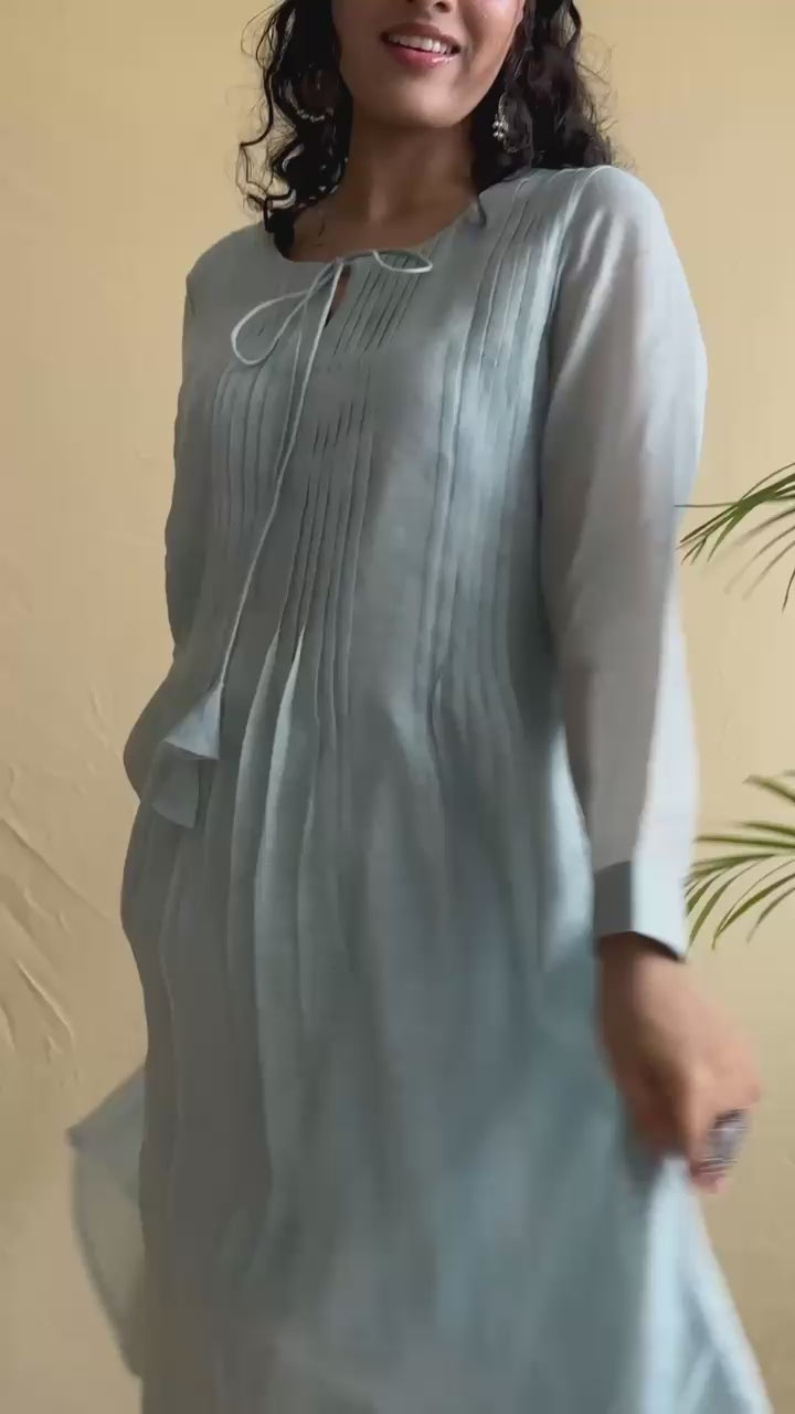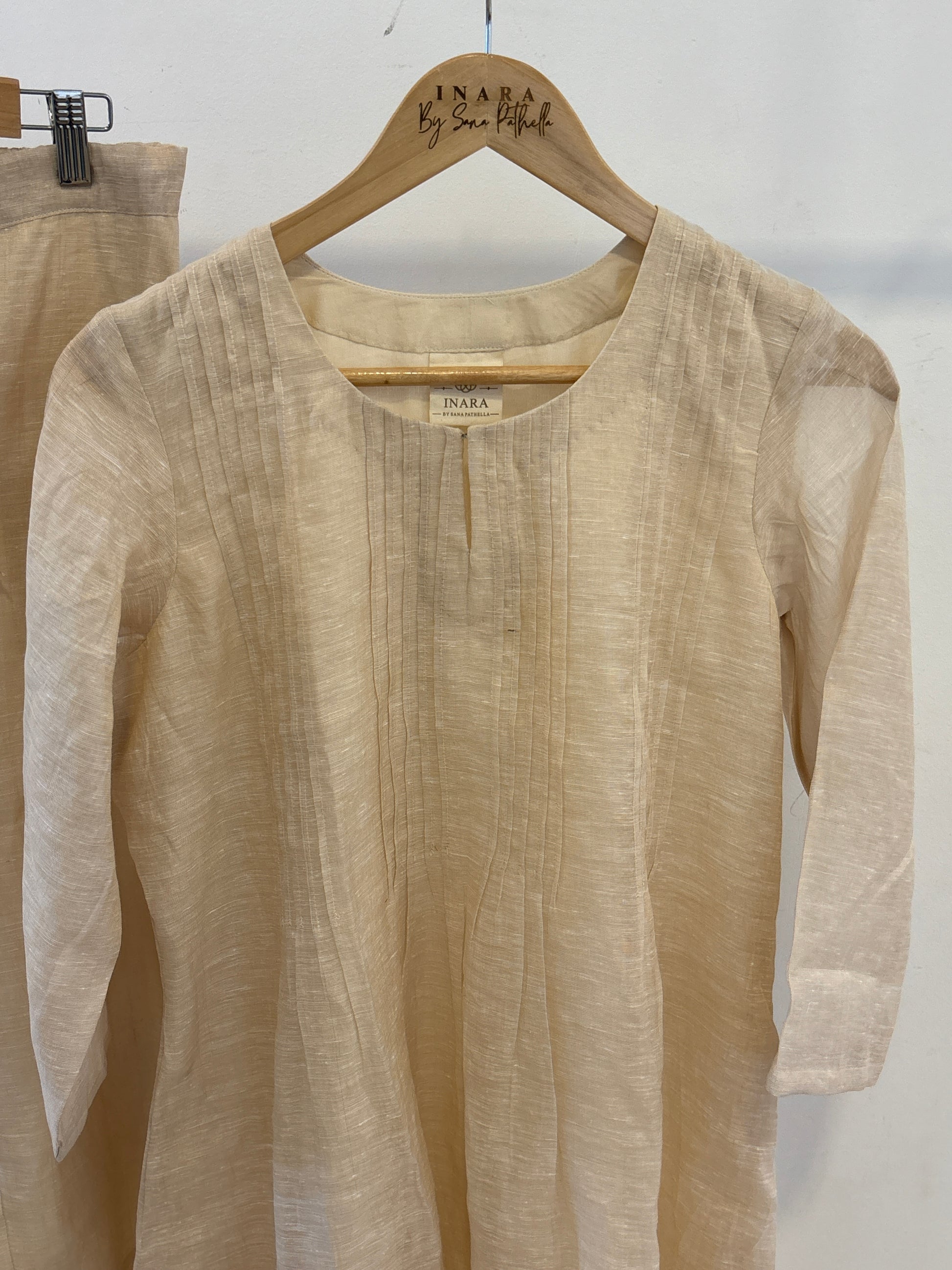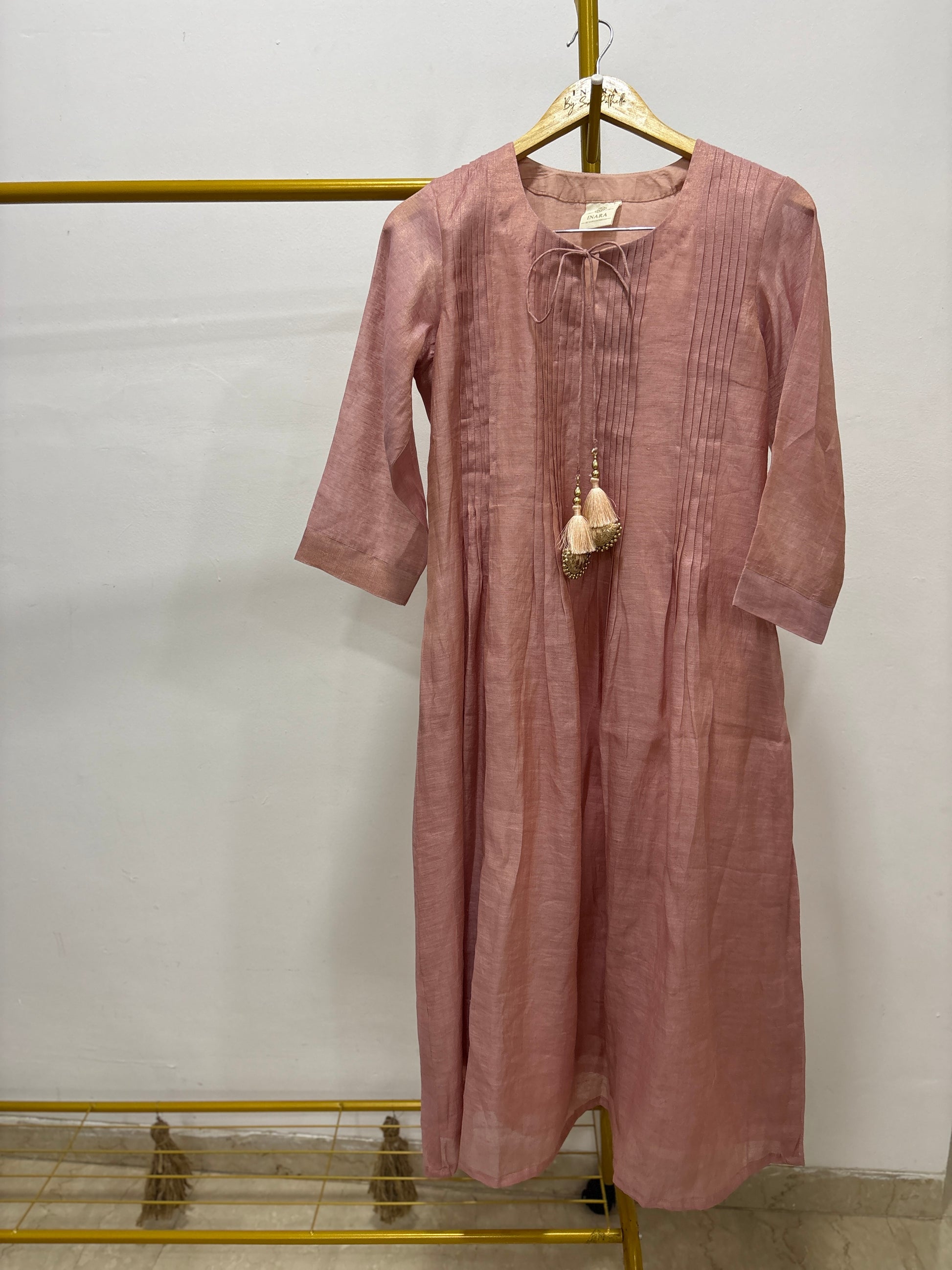 The pintucks pleats, pattern and dori tie with tassels add a playful yet refined touch, perfect for festival wear or casual outings. Available in customizable shades like pink, purple, off-white, and brown, this organic linen kurti set is designed for comfort and style.