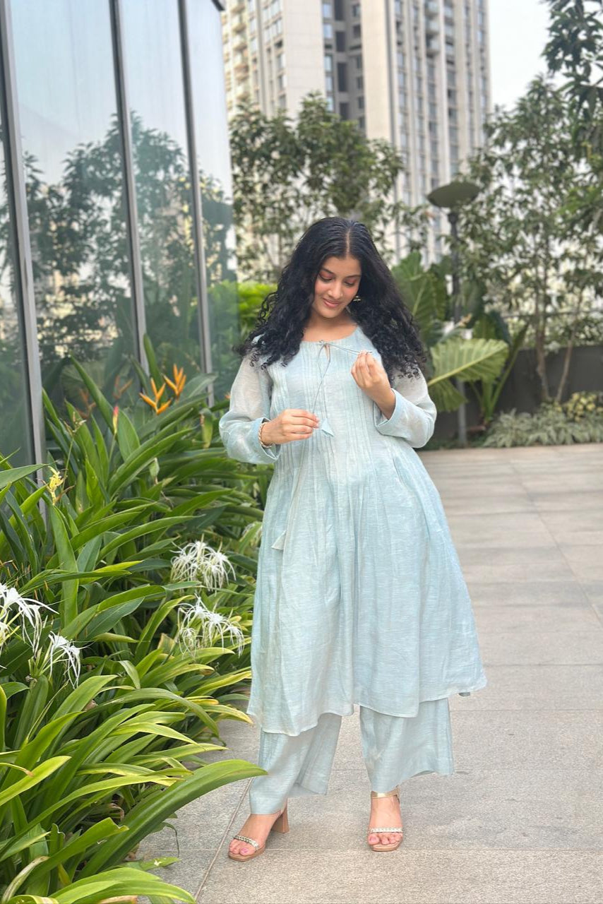 Step into effortless ethnic elegance with our Blue Dori Tie Linen Kurti Set, crafted from summer-friendly linen tissue fabric. This sustainable linen co-ord set blends traditional charm with modern luxury, making it a go-to choice for destination events and everyday wear.