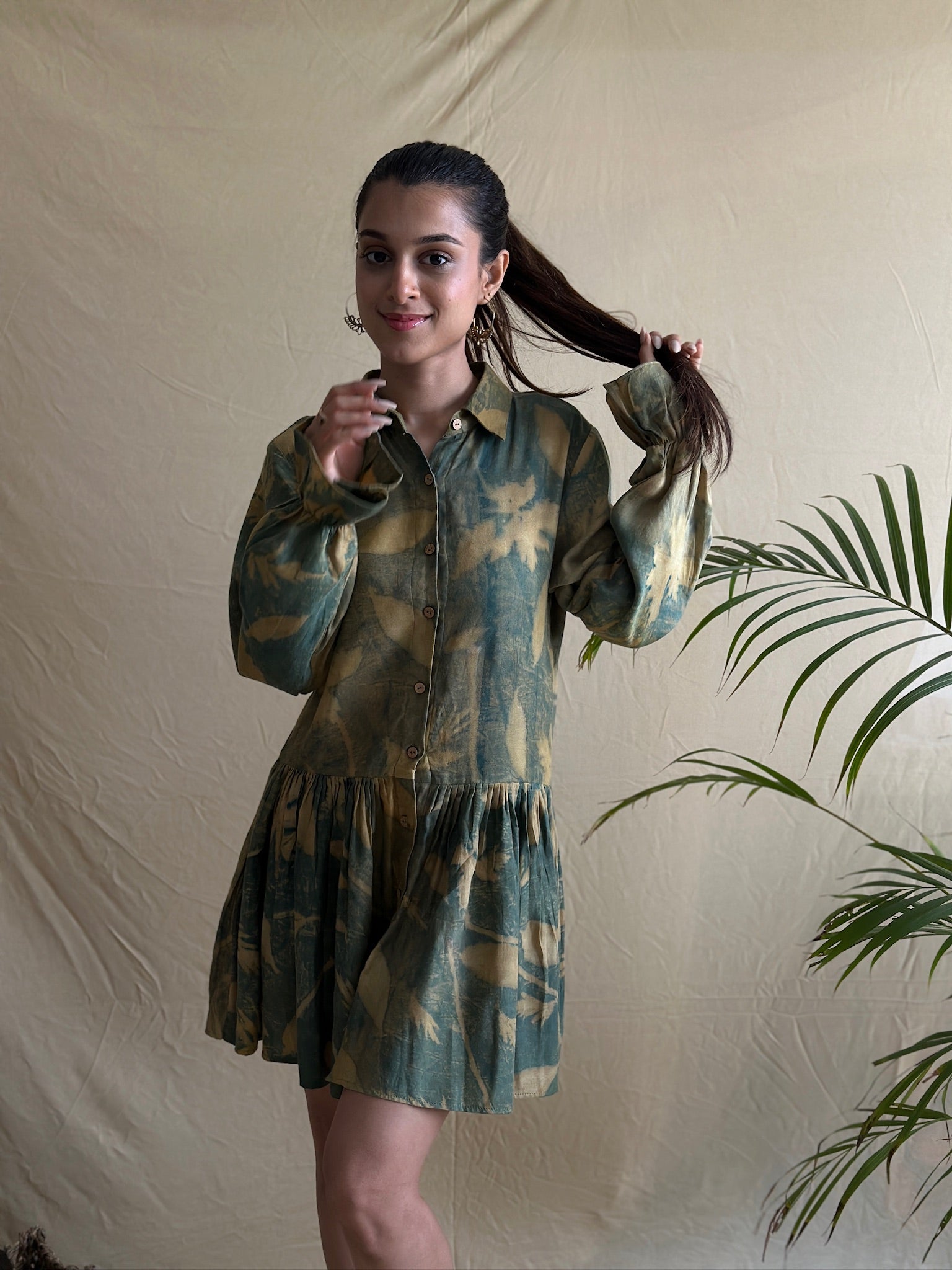 Refresh your summer wardrobe with our Eco Print Green Cotton Dress, featuring a vibrant leaf pattern created with natural dyes. The pleated shirt design adds graceful movement, making it both stylish and sustainable.