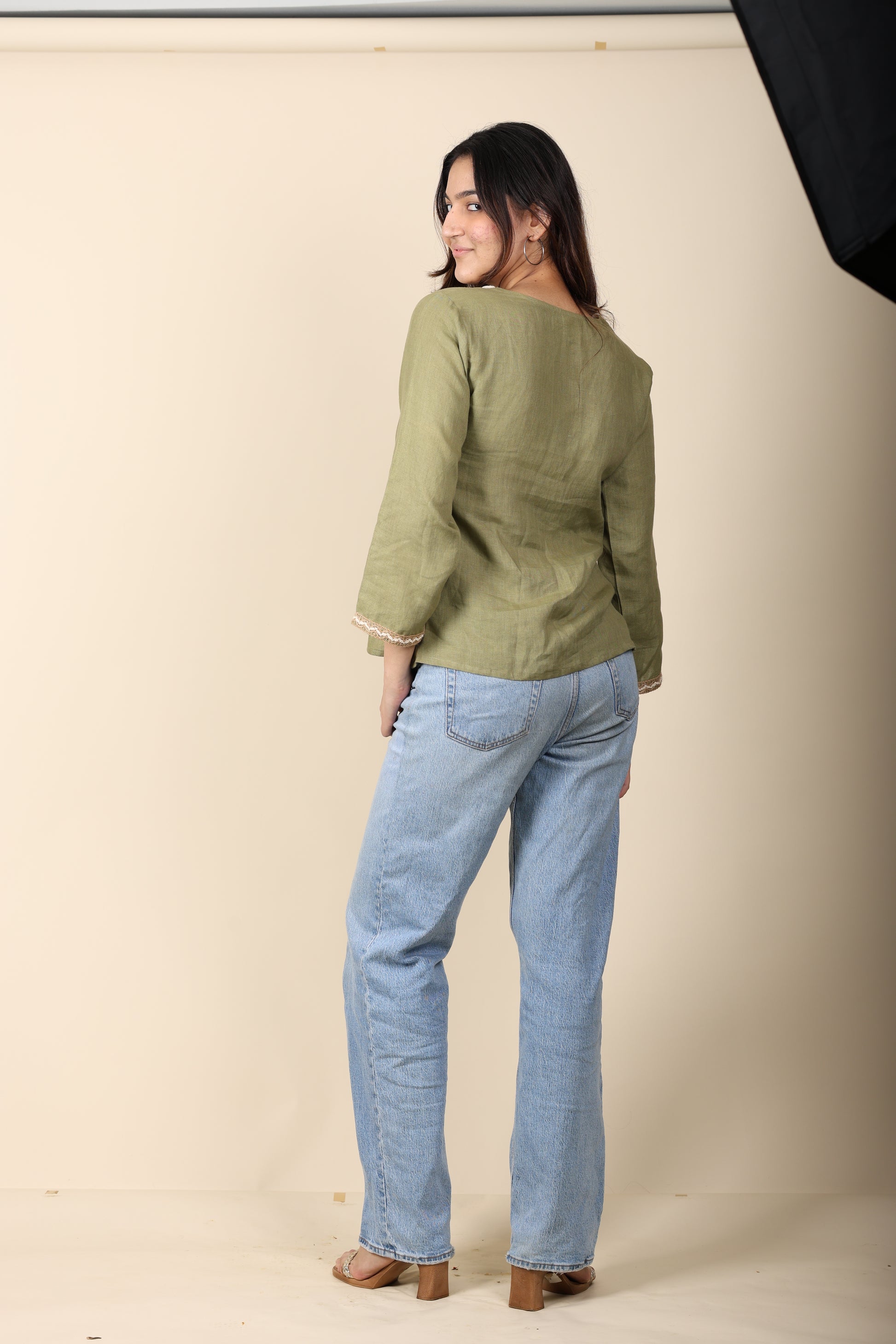 Designed with eco-conscious fabric and intricate crochet detailing, this top combines comfort with timeless fashion.