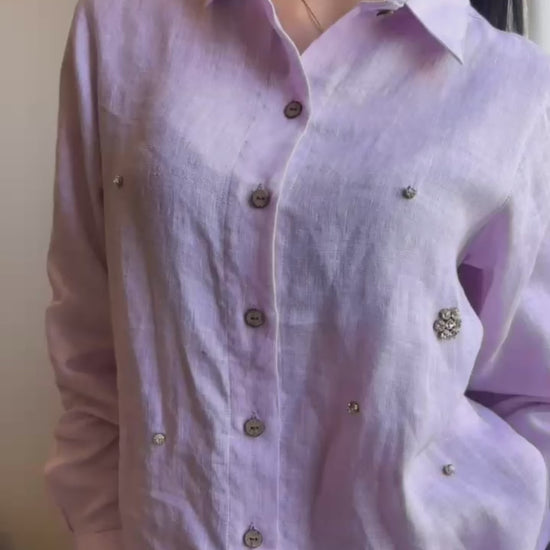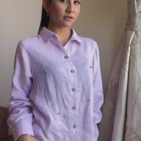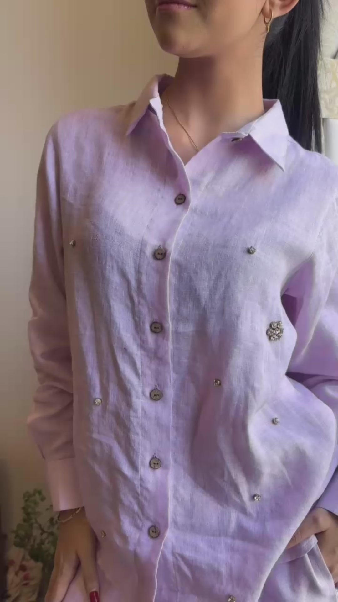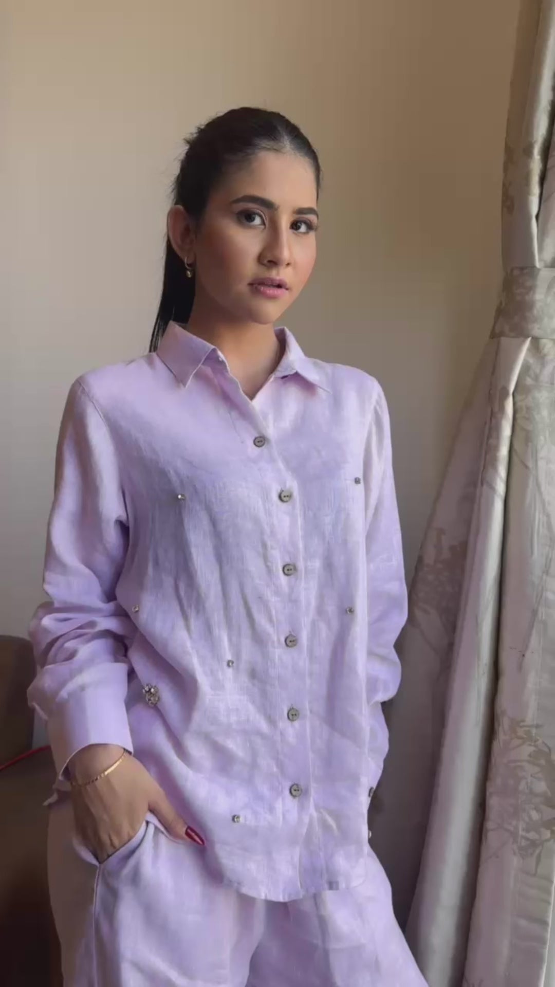 Product Description: Embrace summer elegance with our Light Purple Linen Co-ord Set, crafted from pure linen in a soft mauve hue. The shirt features delicate Swarovski stone detailing, adding subtle sparkle to this breathable ensemble.