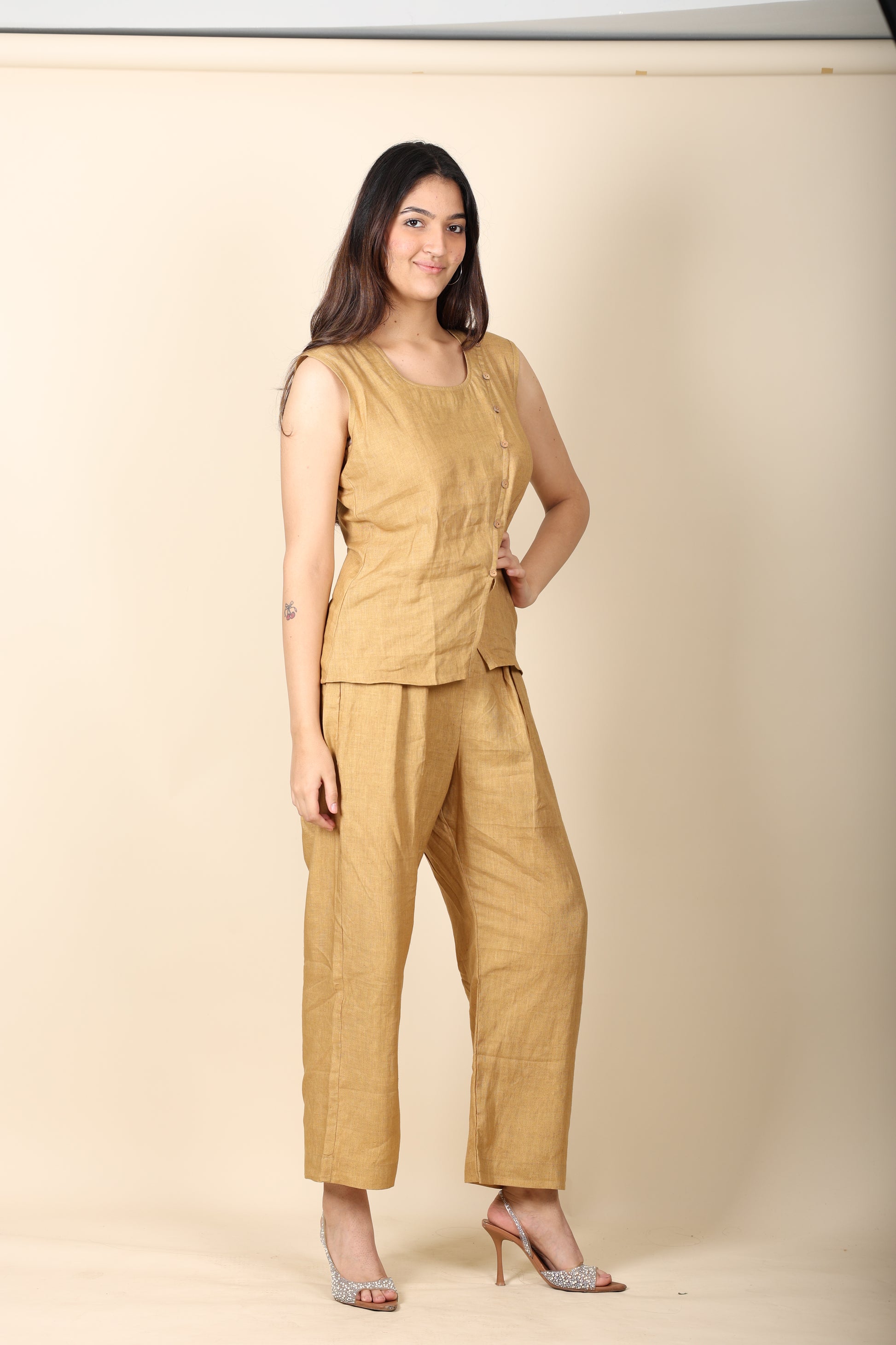 Our beige linen sleeveless co-ord set is the perfect blend of comfort and modern design. Crafted from premium breathable linen, this two-piece outfit keeps you cool while looking chic.