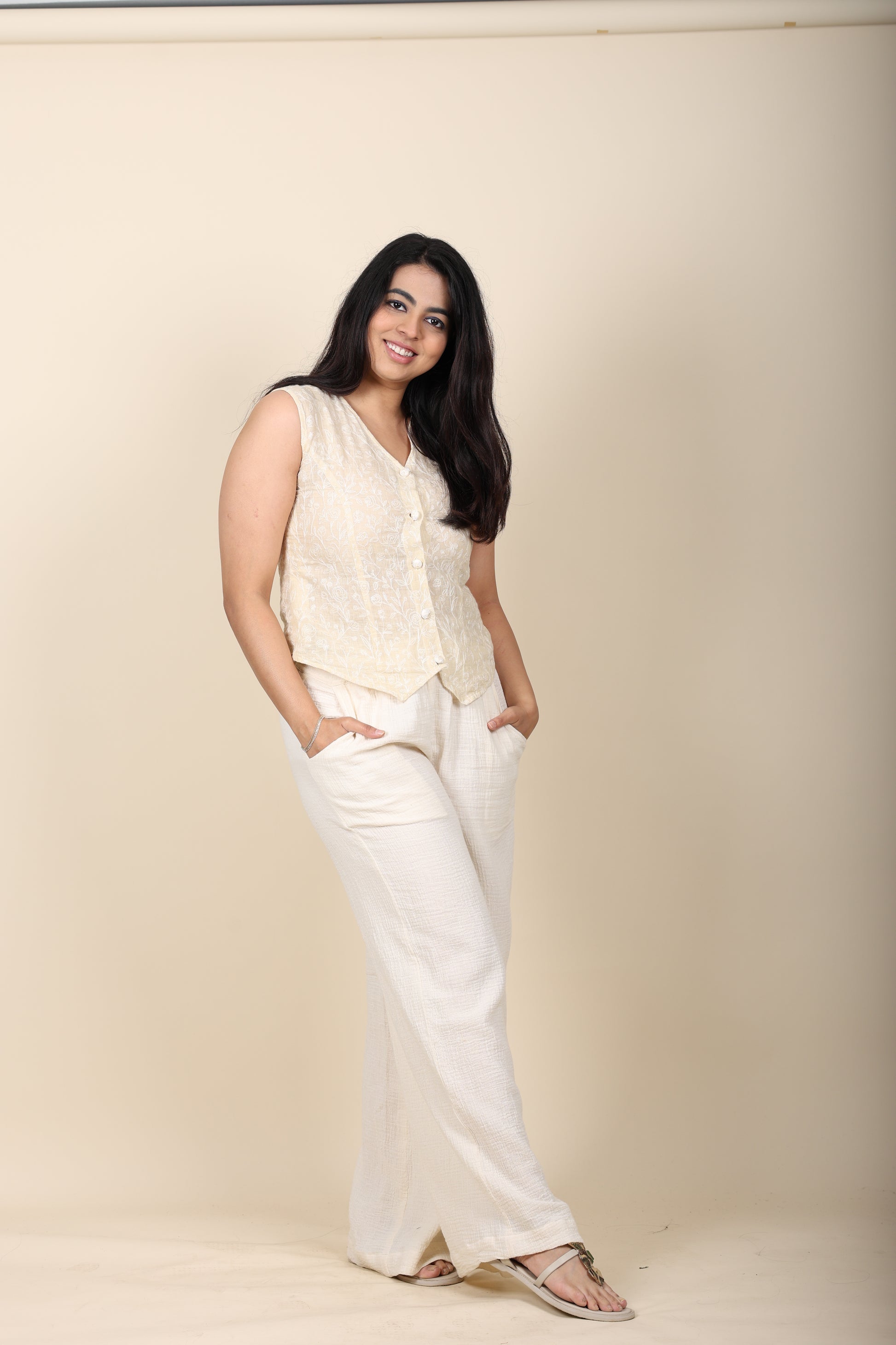 The Linen Embroidered Top with Cotton Gauze Pants is designed for women who appreciate subtle luxury and effortless style. With its lightweight fabrics and graceful detailing, this coord set transitions seamlessly from day to night.