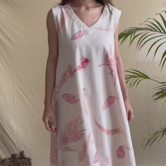 Expertly crafted with natural dyes and a beautiful pink leaf eco print, this knee-length dress blends sustainability with effortless style. Designed for comfort and breathability, it’s the perfect choice for warm summer days.