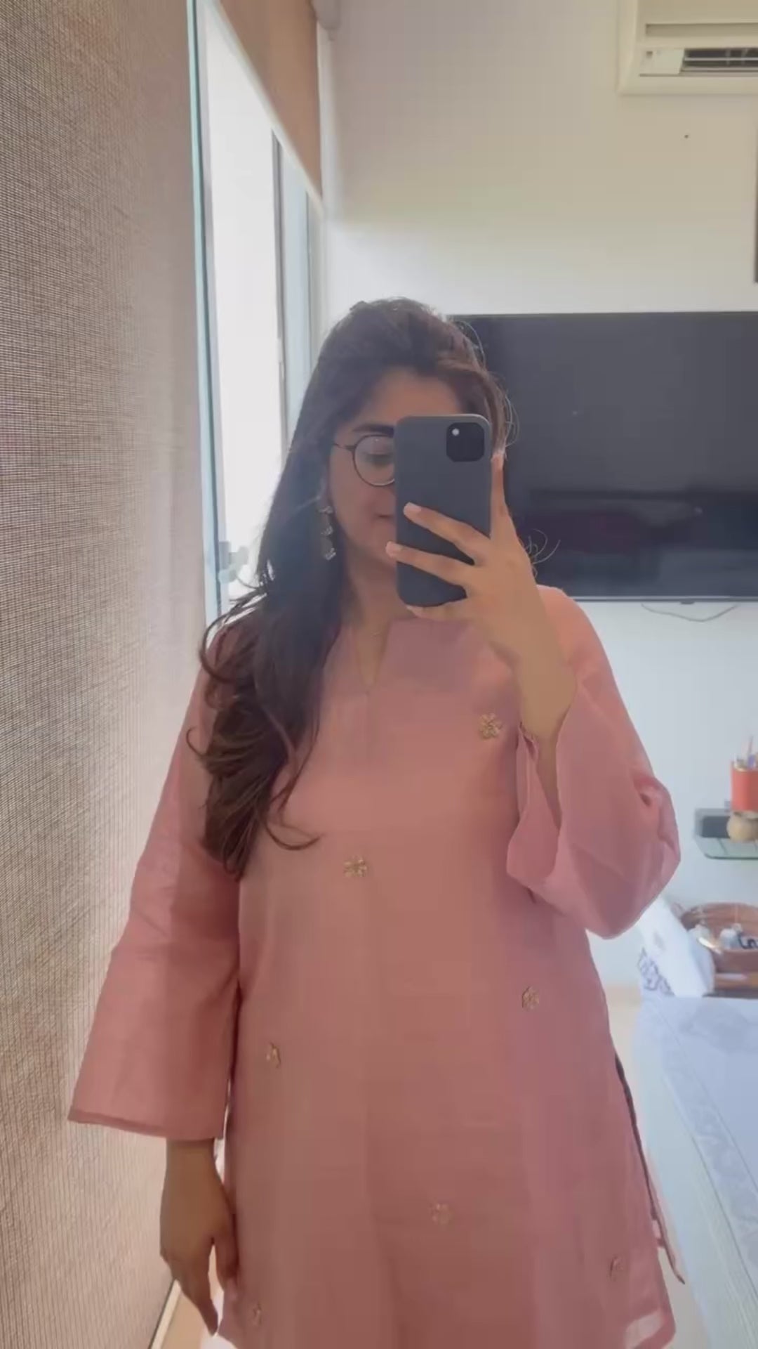 Bring charm to your summer wardrobe with our Short Kurti and Farshi Salwar Set, crafted from premium linen tissue fabric. The kurti is detailed with zardosi work and flower booties, paired with a trending farshi salwar for a graceful look. Available in full pink or a contrast pink-and-brown combination, the set is finished with bell sleeves for a unique fit and style.
