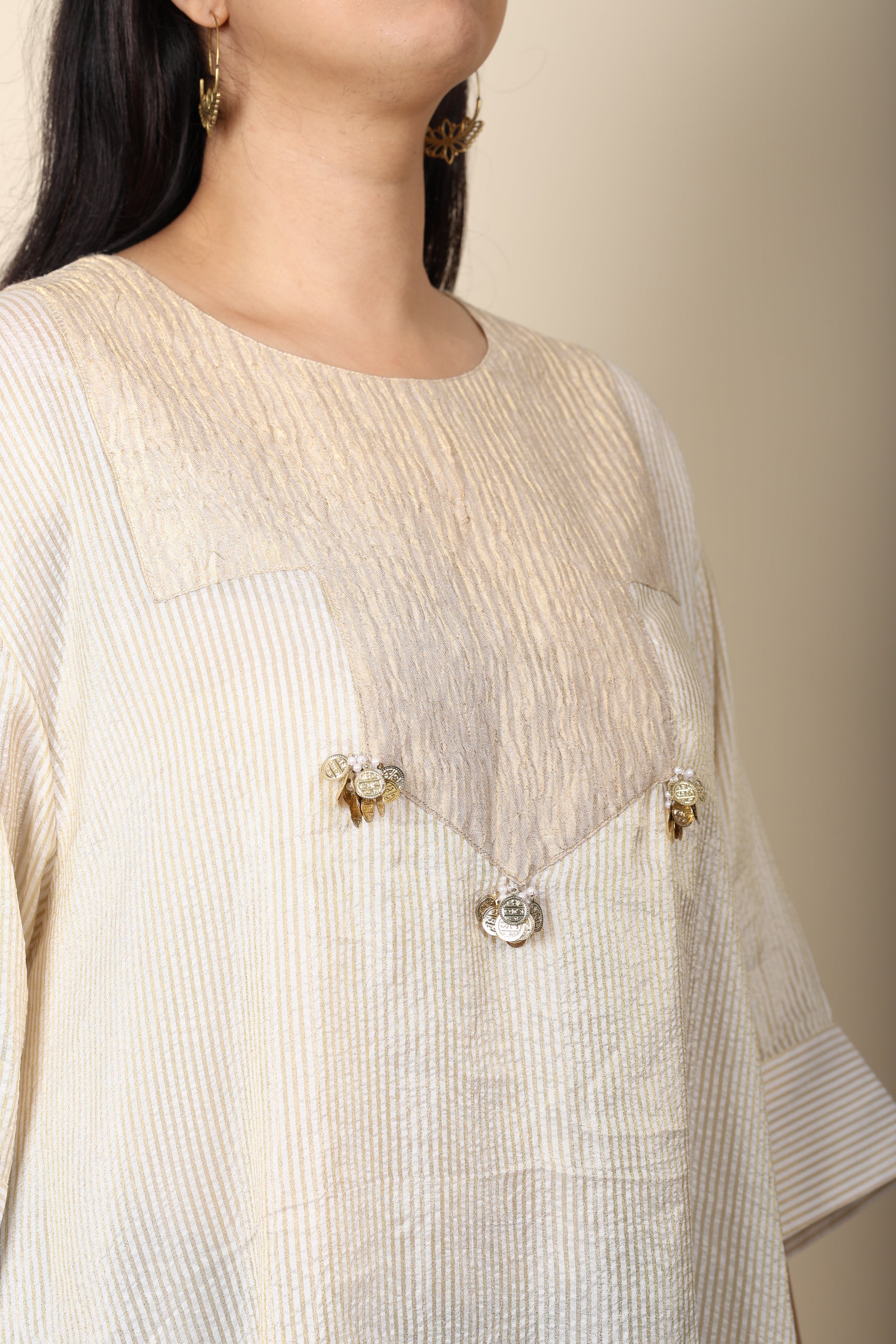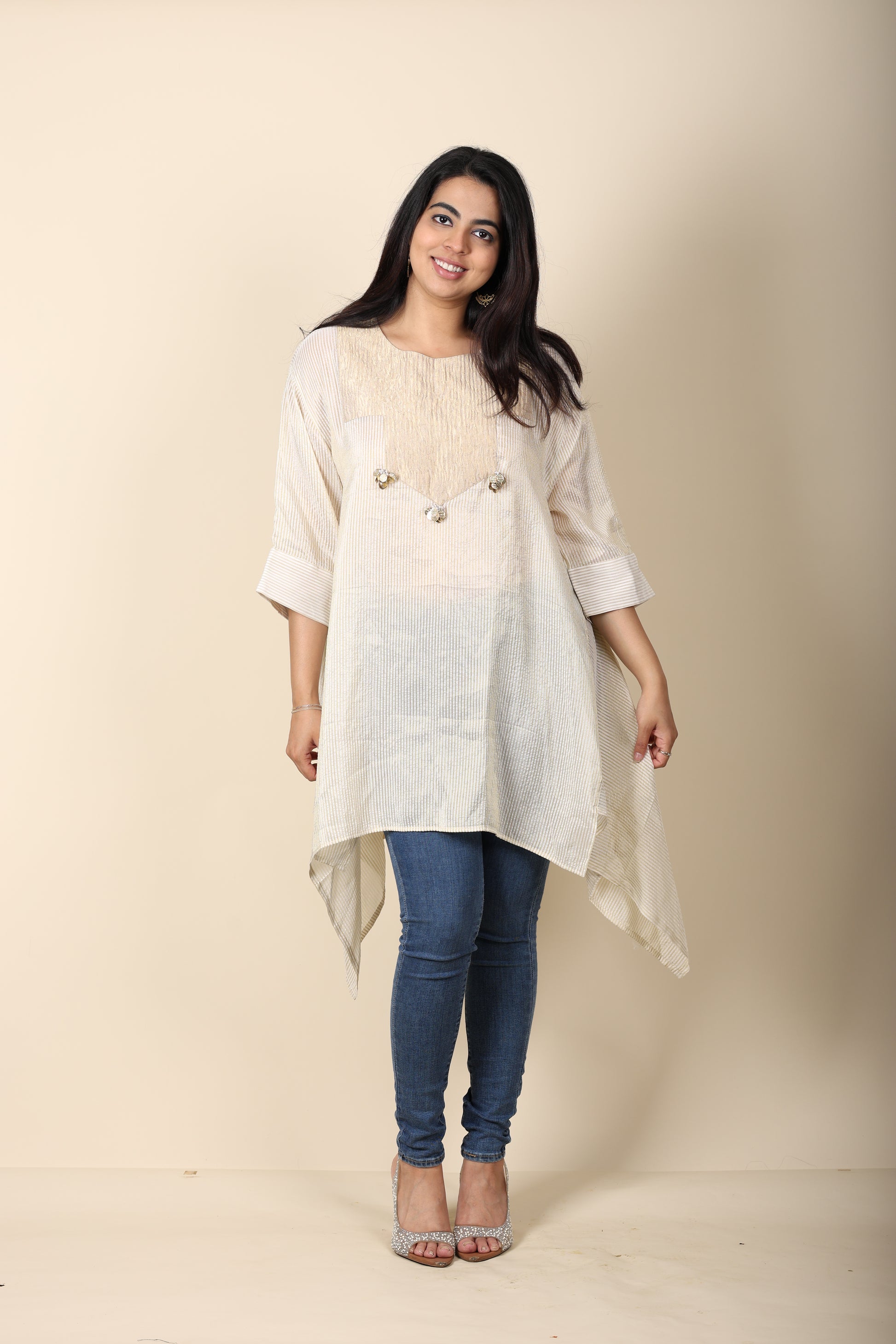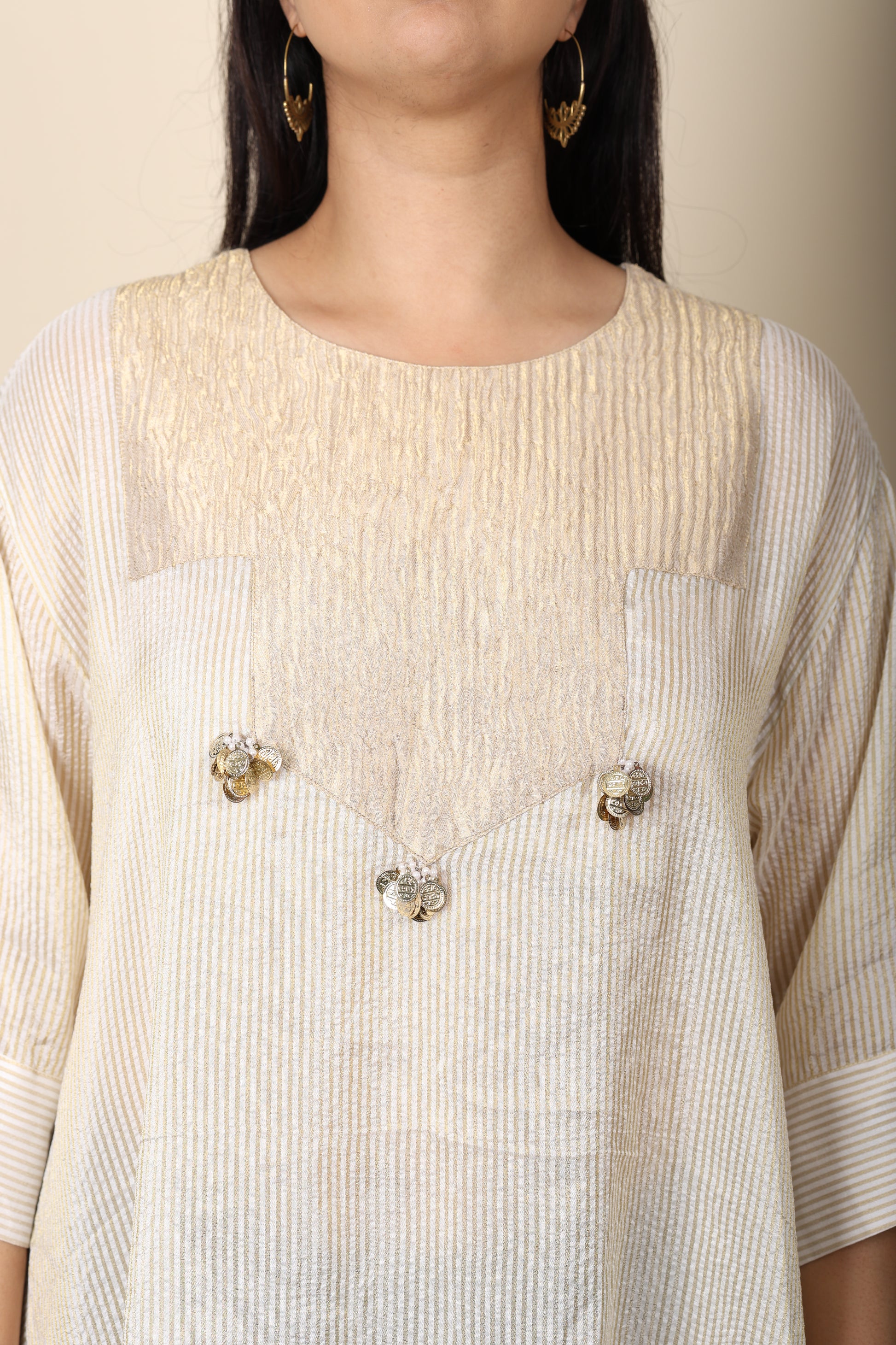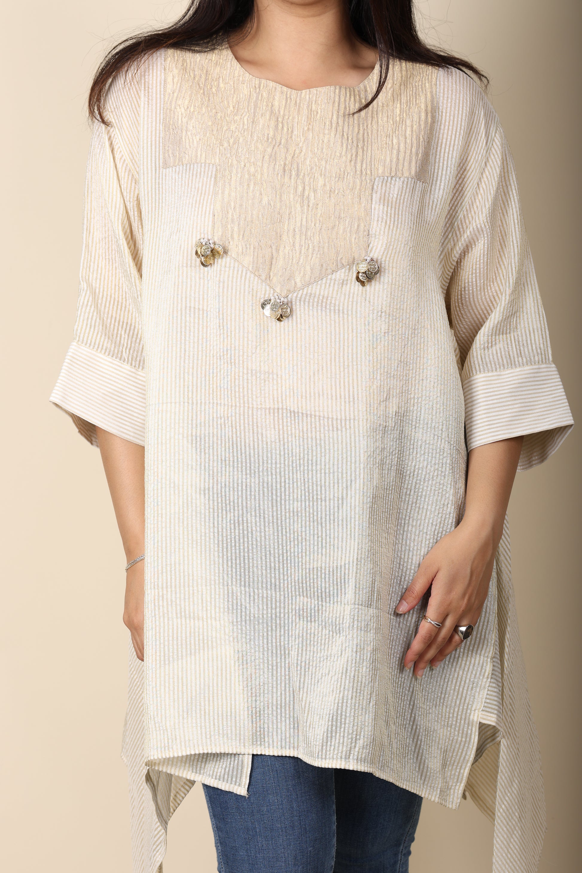 Step into effortless sophistication with our Stripes Tissue Kurti, crafted from delicate crushed tissue fabric in soft off-white stripes. Accented with playful tassel detailing, it brings a subtle festive sparkle while remaining lightweight and breathable for all-day comfort. Whether paired with jeans for a relaxed look or a matching set for polished coordination, it’s a perfect blend of tradition and modern adaptability.
