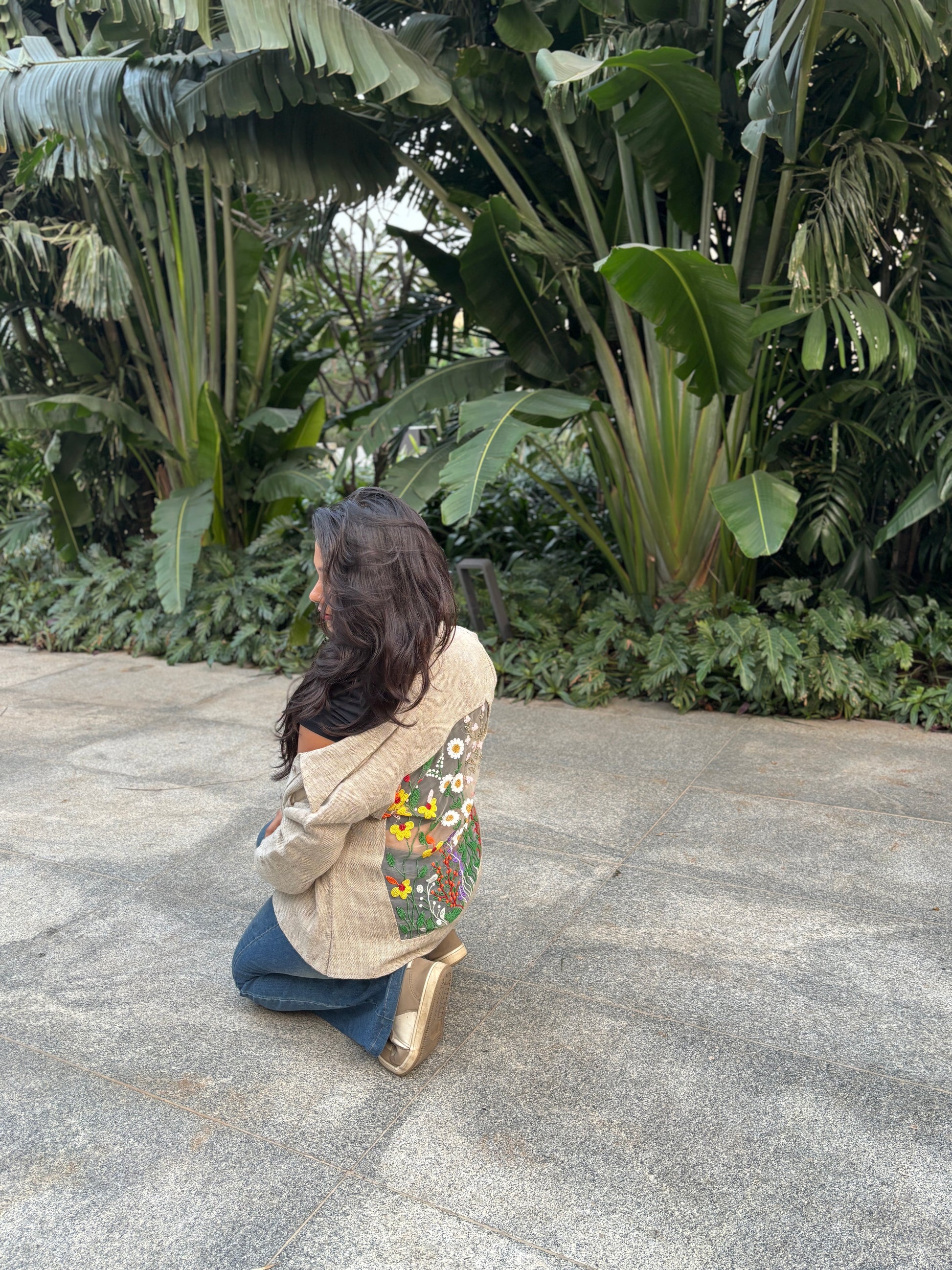Each jacket features a stunning organza panel intricately hand-embroidered with beadwork that captures the vibrancy of wildflowers. The delicate detailing stands out beautifully against the earthy texture of pure hemp fabric, giving the piece both sophistication and whimsy. Every stitch tells a story of patience, precision, and love for handmade art.